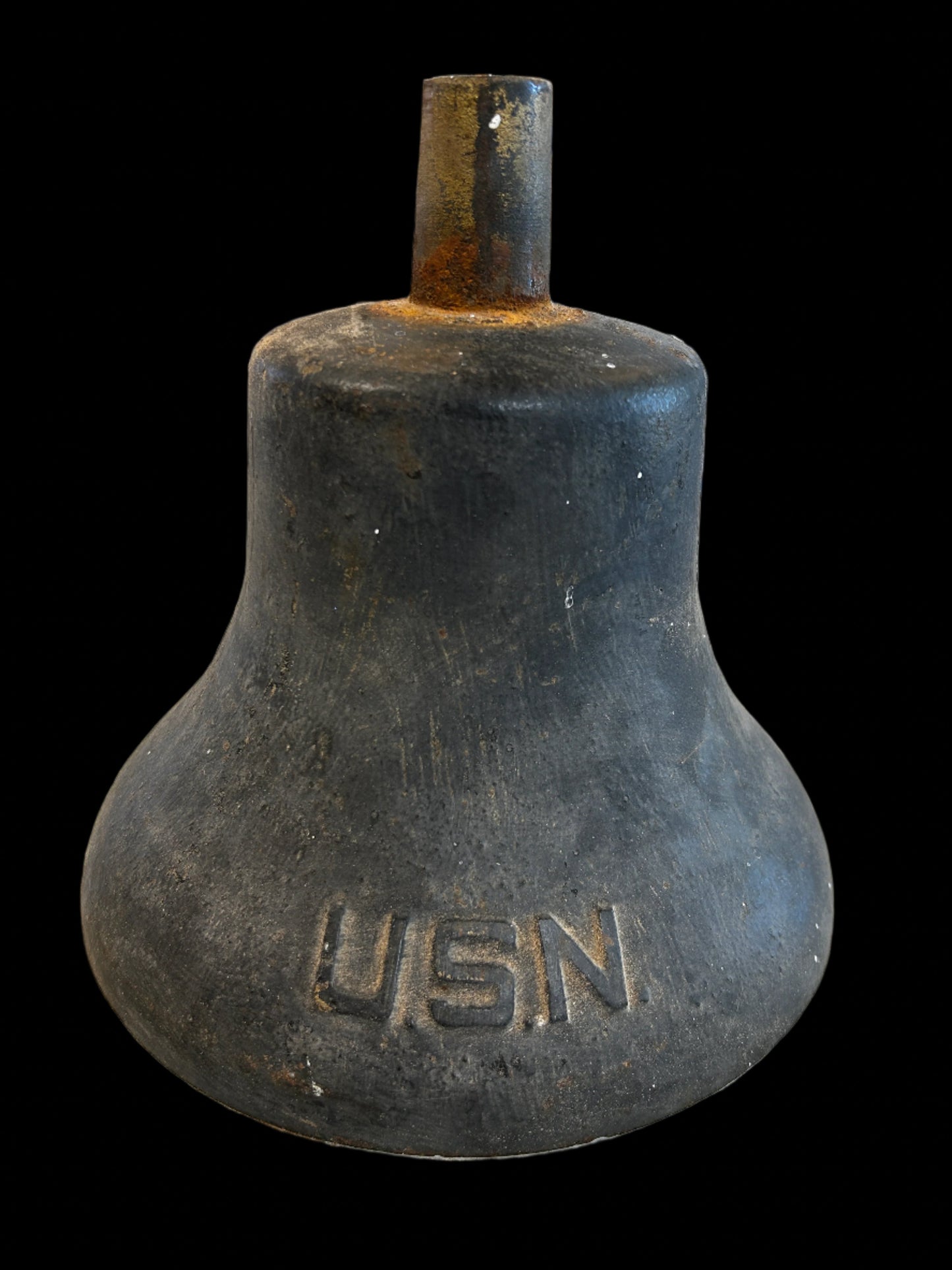 An iron U.S. Navy ship’s bell, though less common than brass bells, served the same essential purposes on naval vessels: marking time, signaling watches, and sounding alerts. The use of iron, likely on smaller or utility ships, added weight and durability in harsh marine environments. This authentic iron USN bell is engraved with “USN" and has a distinctive, lower pitch compared to brass. Collectors and naval enthusiasts prize these bells for their historical significance and connection to naval tradition.