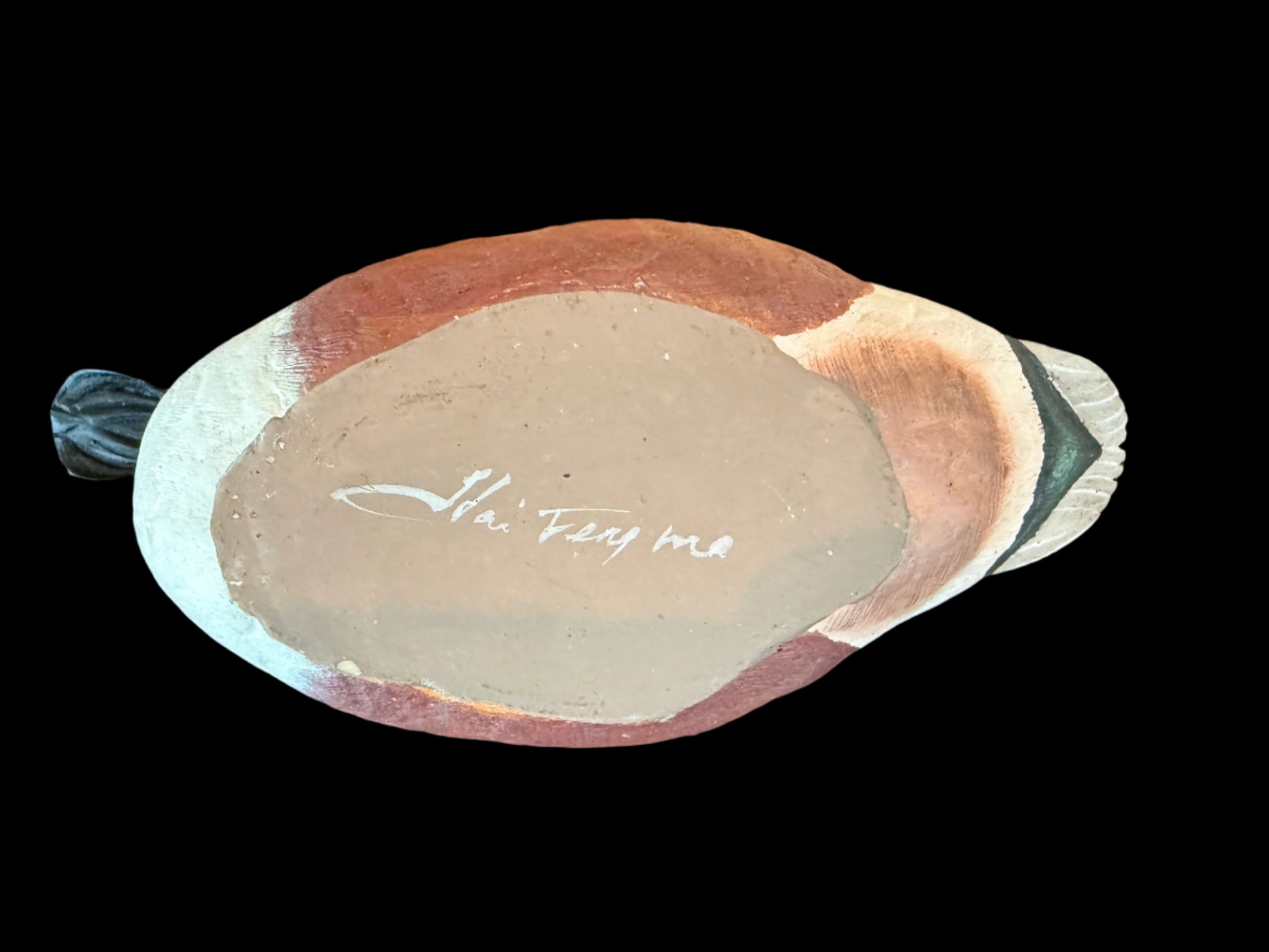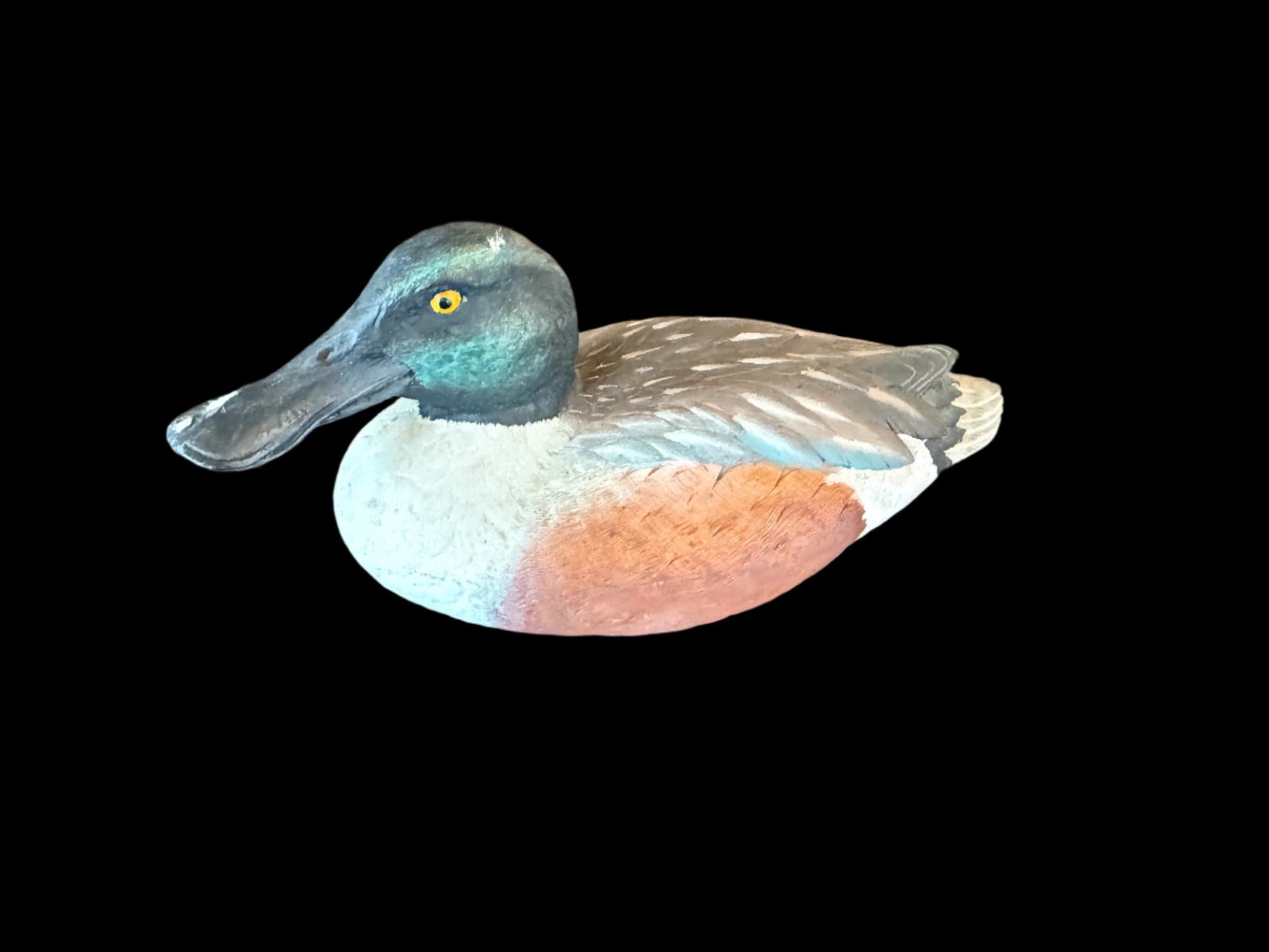 This 7.5” hand-painted ceramic duck sculpture captures the distinctive profile and vibrant plumage of a Northern Shoveler drake. Meticulously modeled and textured, it features rich teal, rust, and gray tones with lifelike feather detail and piercing yellow eyes. The underside is signed by the artist, adding character and collectibility. A wonderful piece for wildlife lovers, cabin decor, or collectors of folk-style waterfowl art.