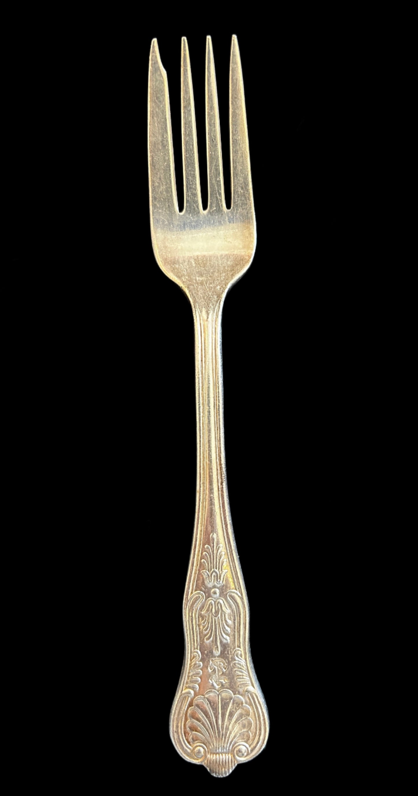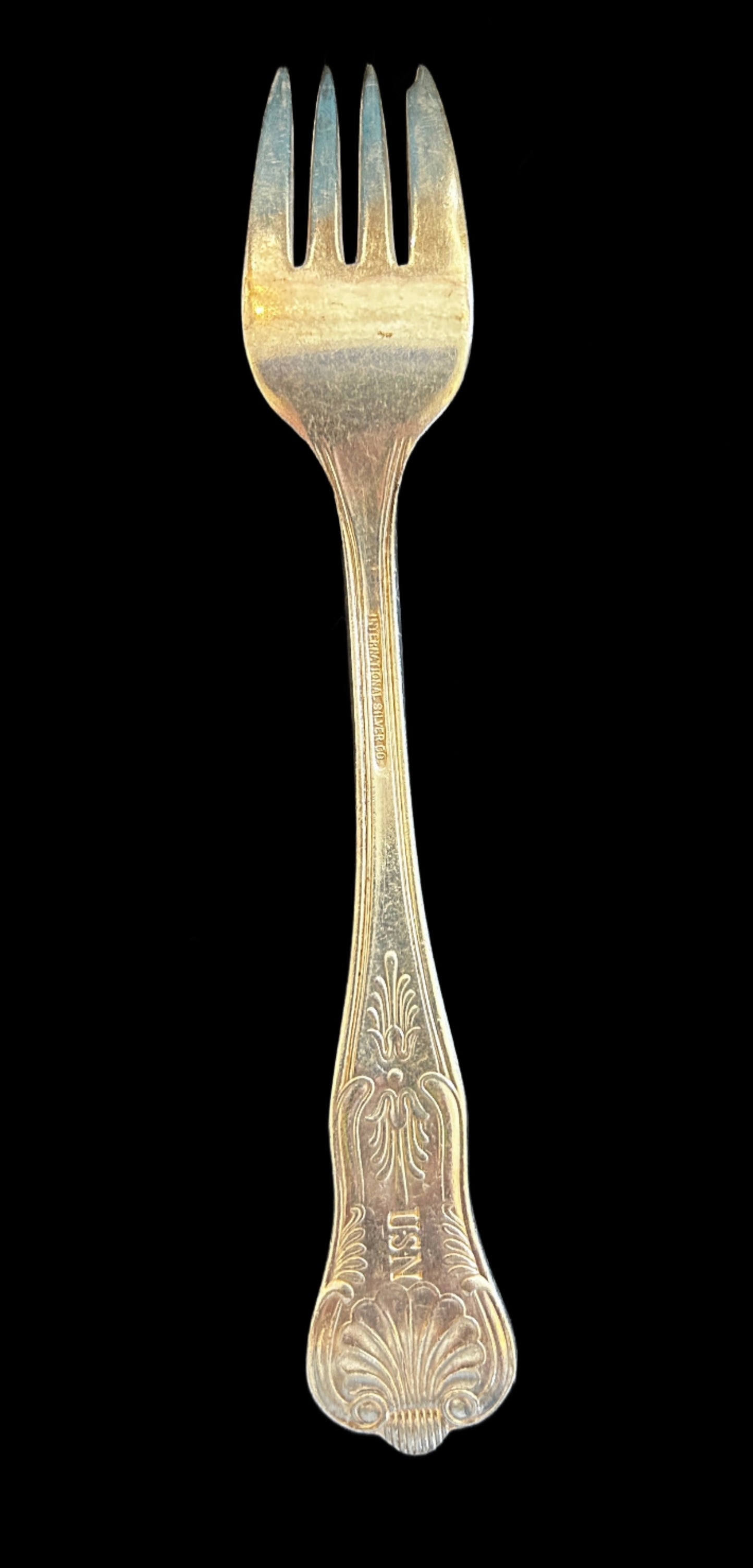 (1) US Navy 7" Silver solder fish fork. Marked with "USN" on the back and an anchor on the front. Kings pattern. Manufacturer's mark, International Silver Co.