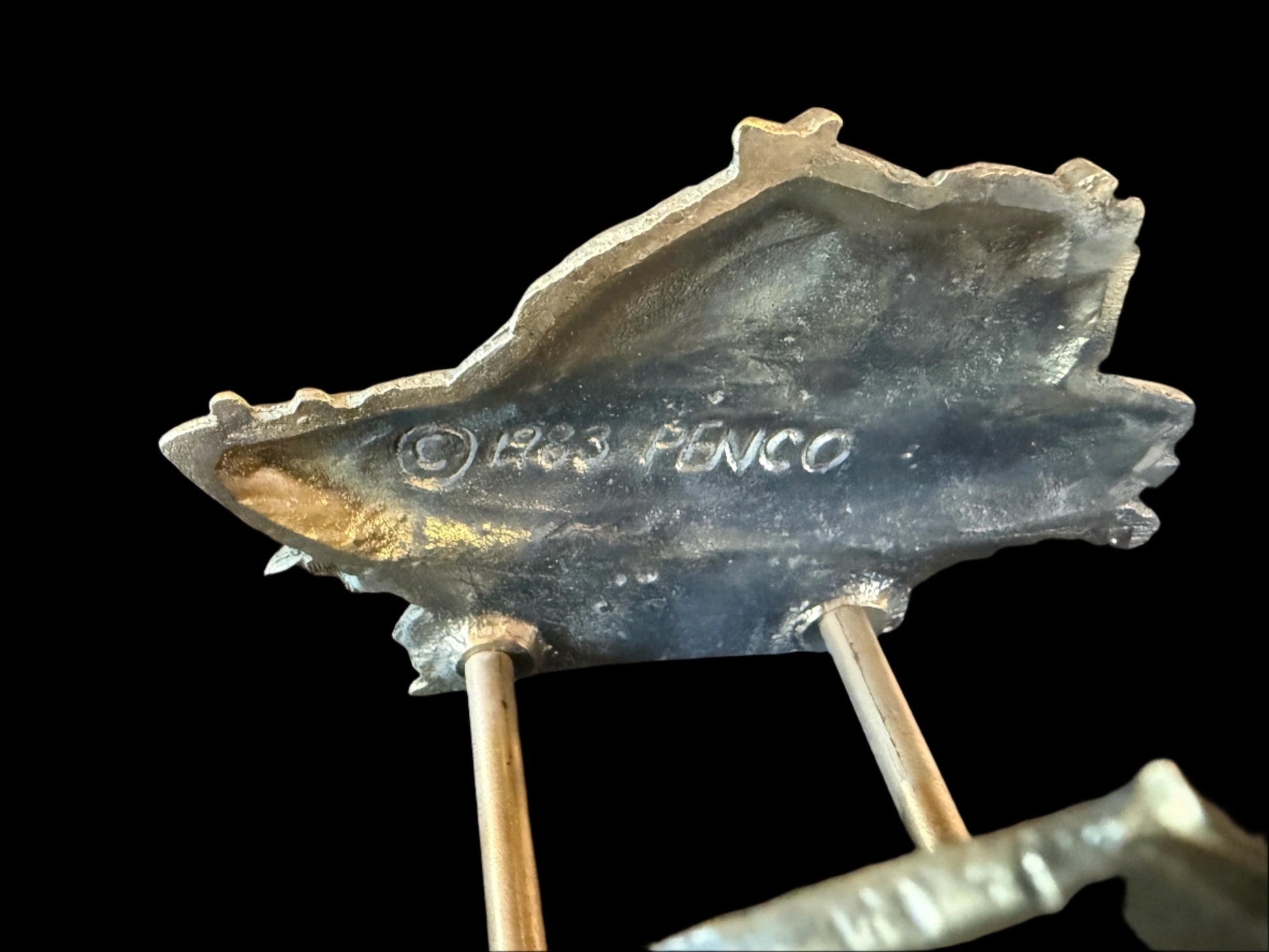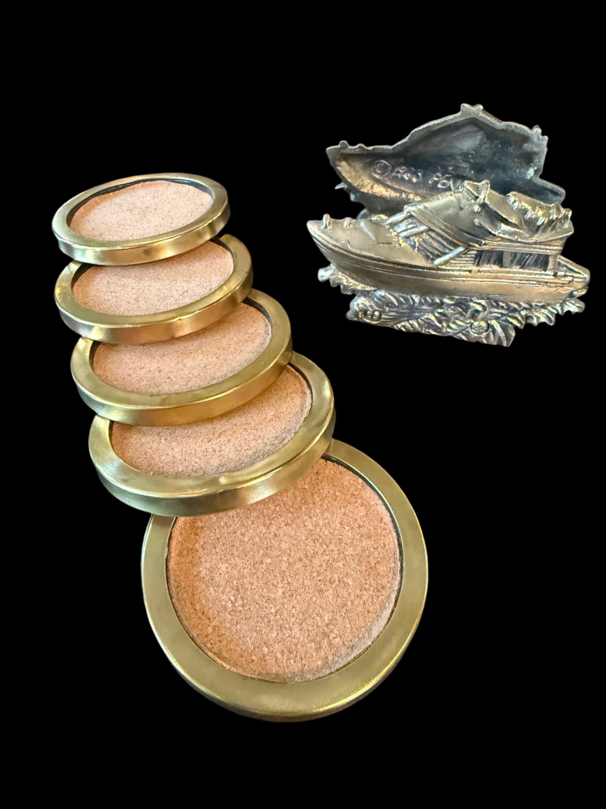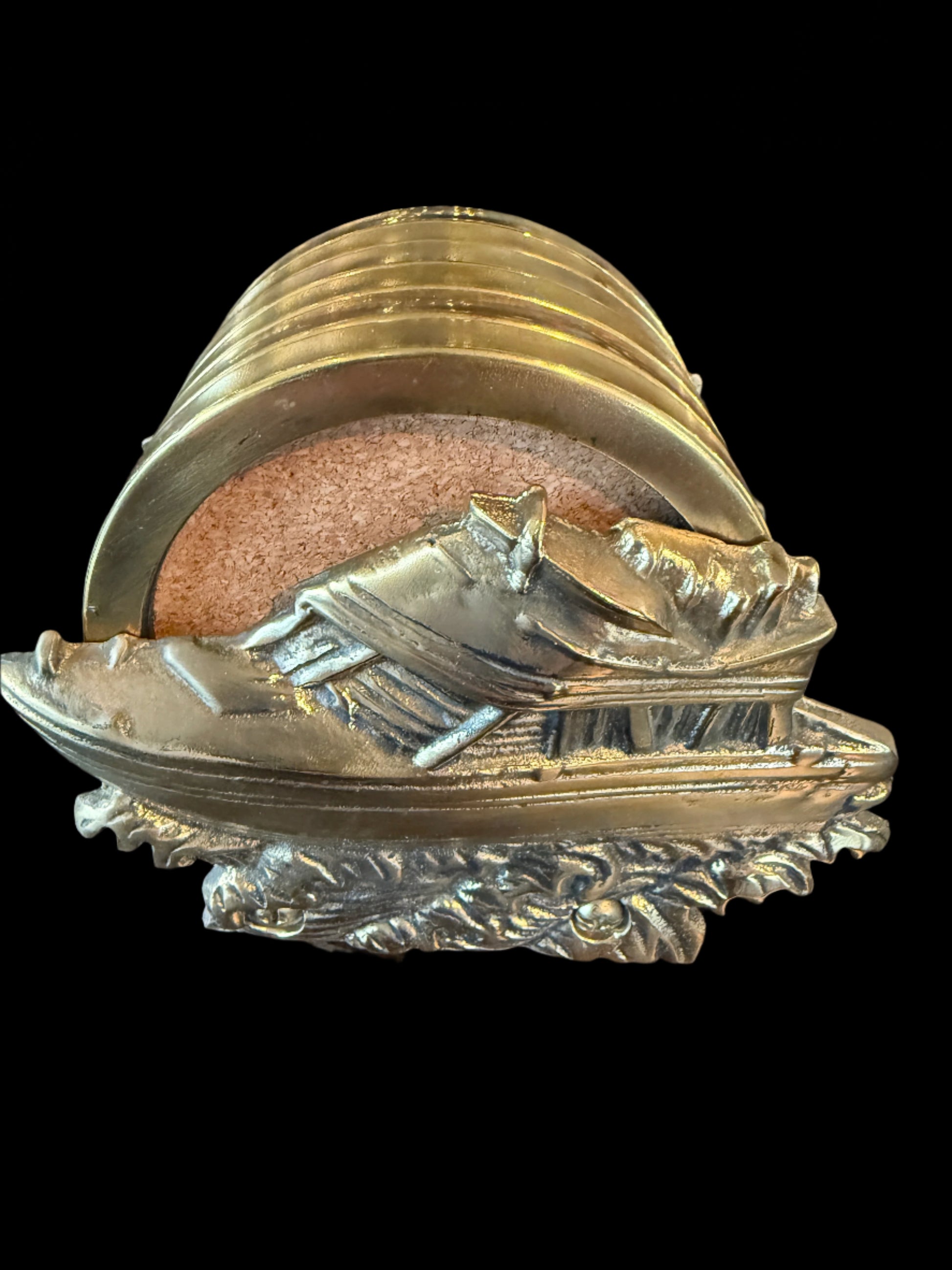 Add a splash of vintage charm to your entertaining space with this 1983 Penco nautical coaster set. Featuring a sculpted classic speedboat in full throttle over ocean waves, the cast metal frame cradles several cork coasters, combining form and function in a bold design. Finished in a polished gold-tone, this set is perfect for maritime collectors or fans of 1980s barware style.