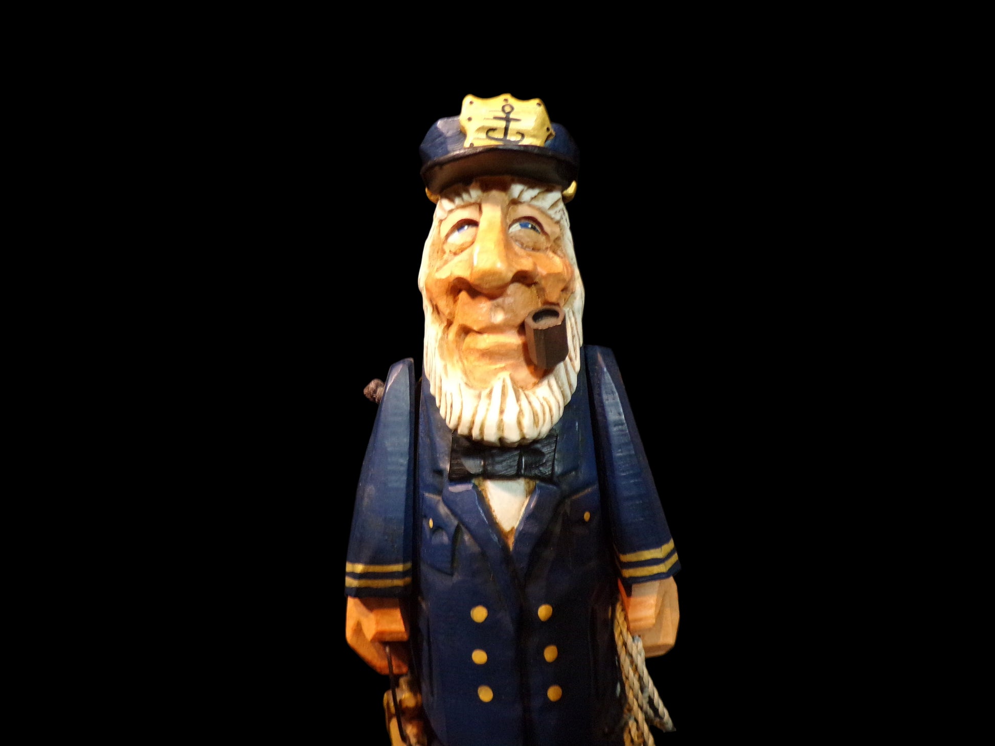 Expertly hand-carved and painted, the figure depicts a cheerful sea captain in a blue uniform, complete with rope and pipe, standing proudly on a wood-style base. The bottom retains its original foil label and felt pads, certifying authenticity.