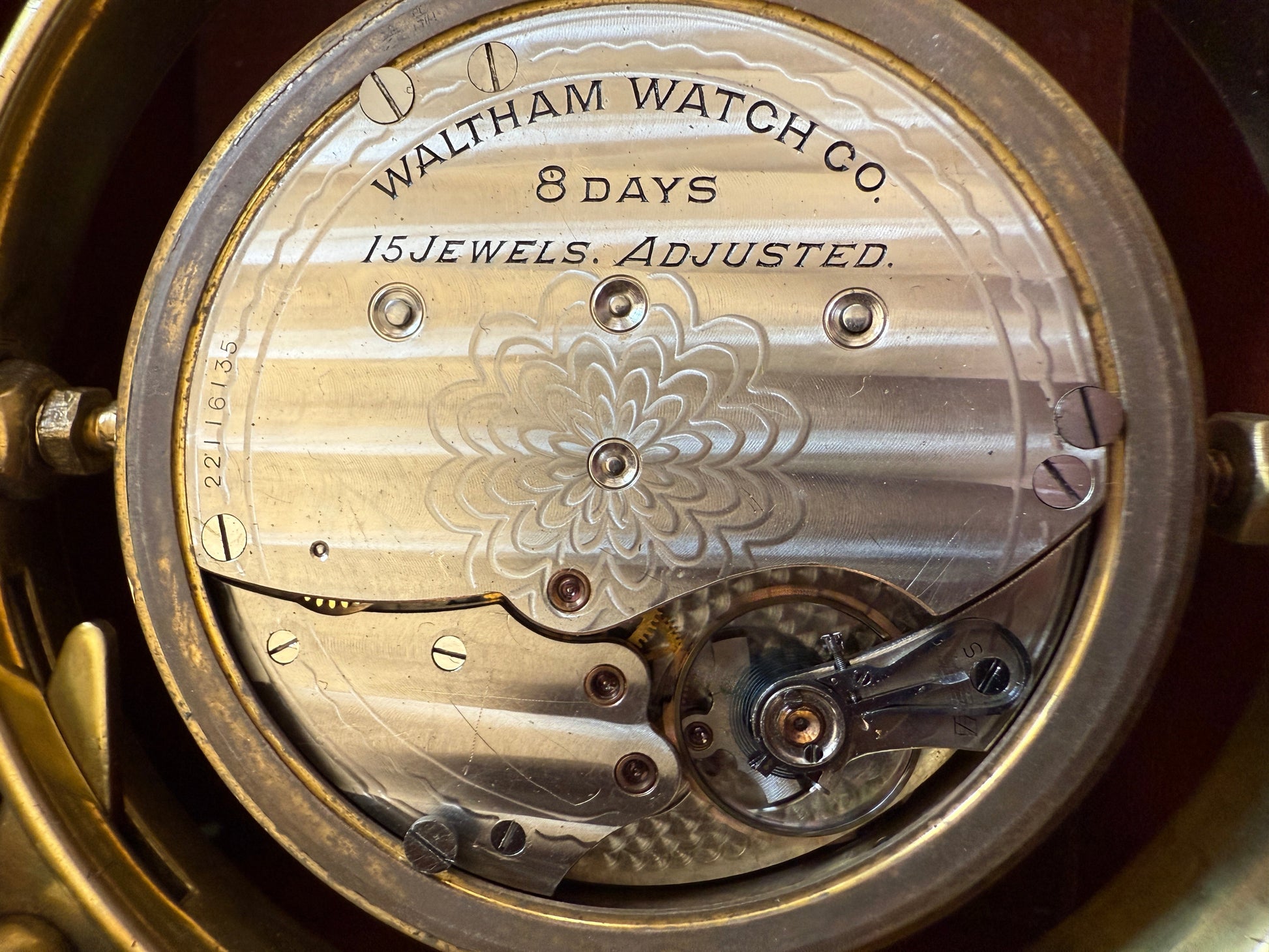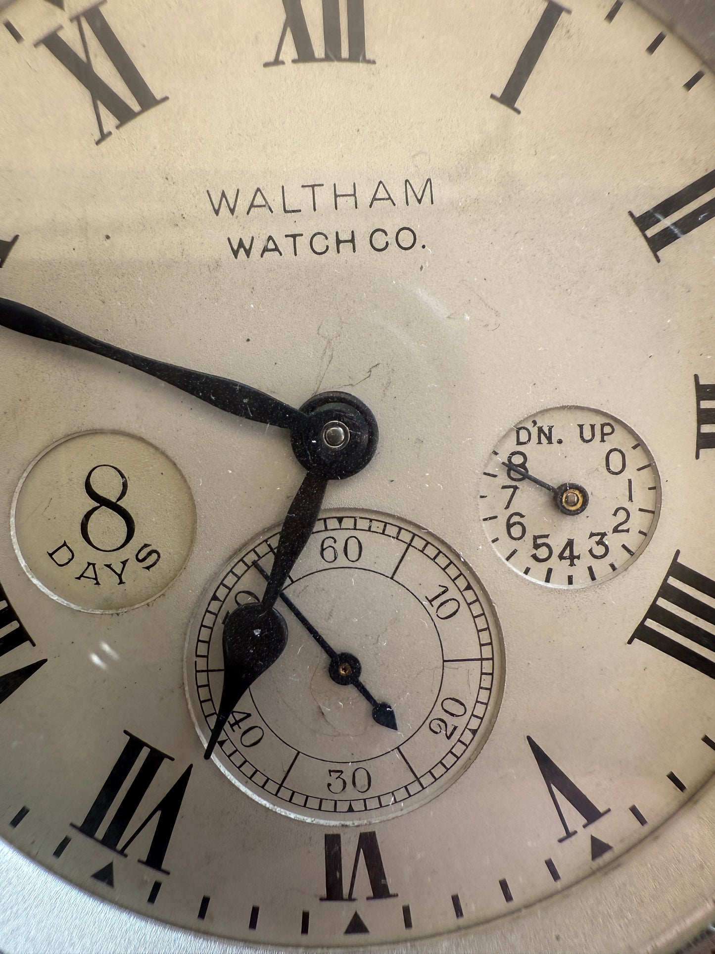 The clean white dial bears bold Roman numerals, along with three subdials indicating running seconds, power reserve (Up/Down), and the 8-day duration. The dial is signed “Waltham Watch Co.”, with additional markings indicating “8 Days, 15 Jewels, Adjusted” engraved on the movement.