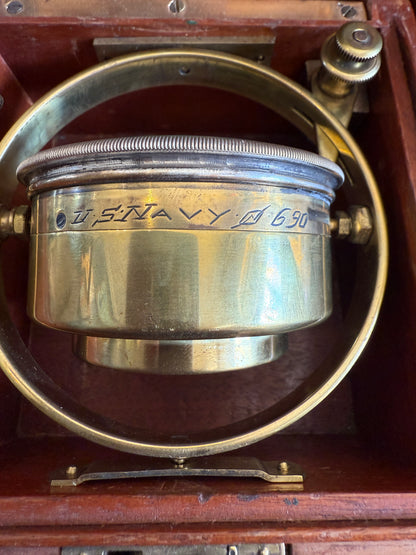 This piece is marked “U.S. Navy 690”, identifying it as a military-issued instrument, likely used for navigational support aboard a U.S. Navy vessel during or just after World War I. The gimbaled suspension allowed it to remain level at sea, essential for accurate timekeeping.