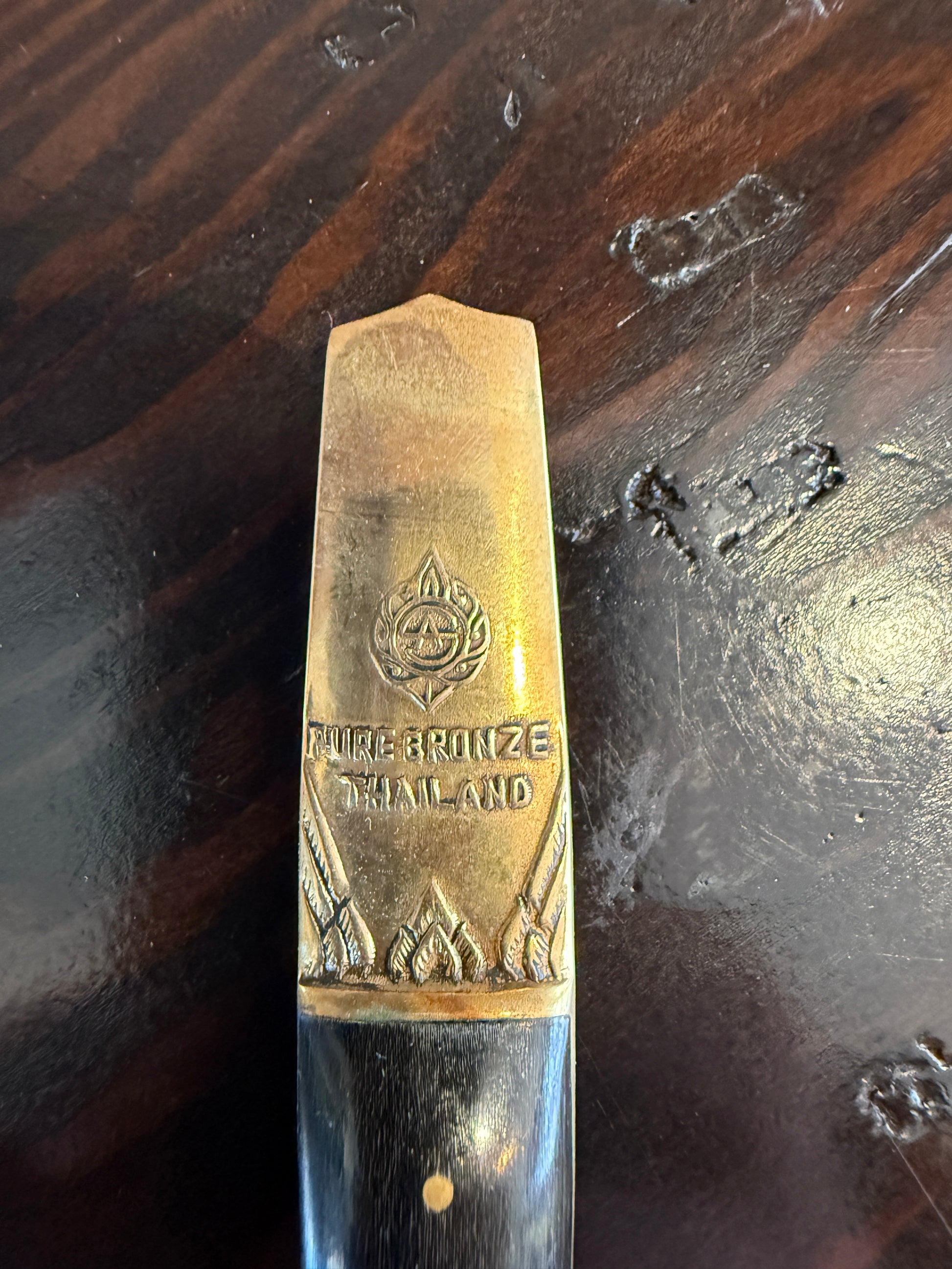 The decorative bronze handles bear motifs of Thai guardians and symbols, blending functionality with cultural artistry. The maker’s mark, “Pure Bronze Thailand” and “Napa Jewelry – Specialist in Thai Art”, is visible on several pieces.
