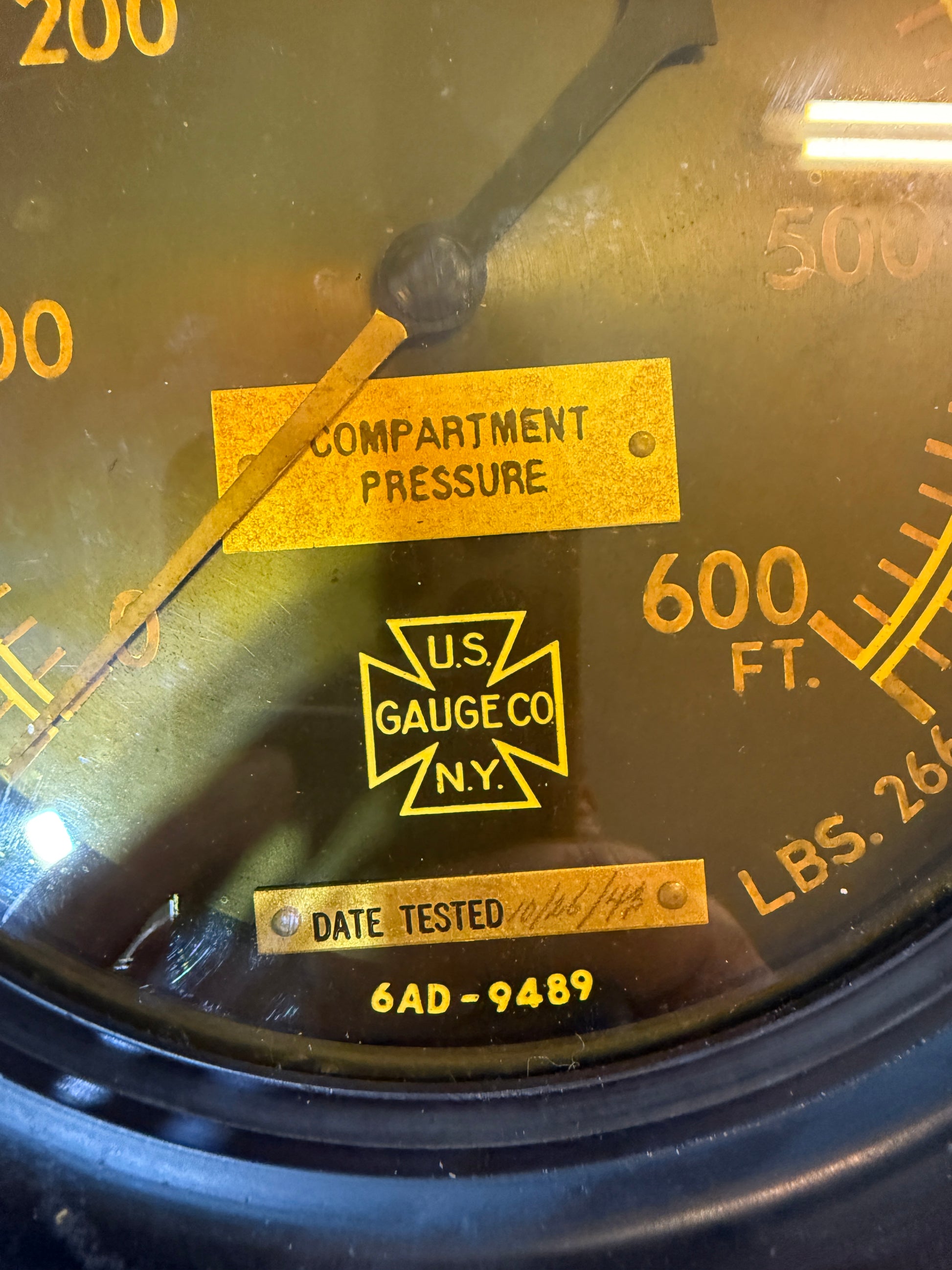This Compartment Pressure Gauge, marked by US Gauge Co NY, is a reliable tool for measuring pressure in various compartments. Date Tested states 10/26/43. Model 6AD-9489