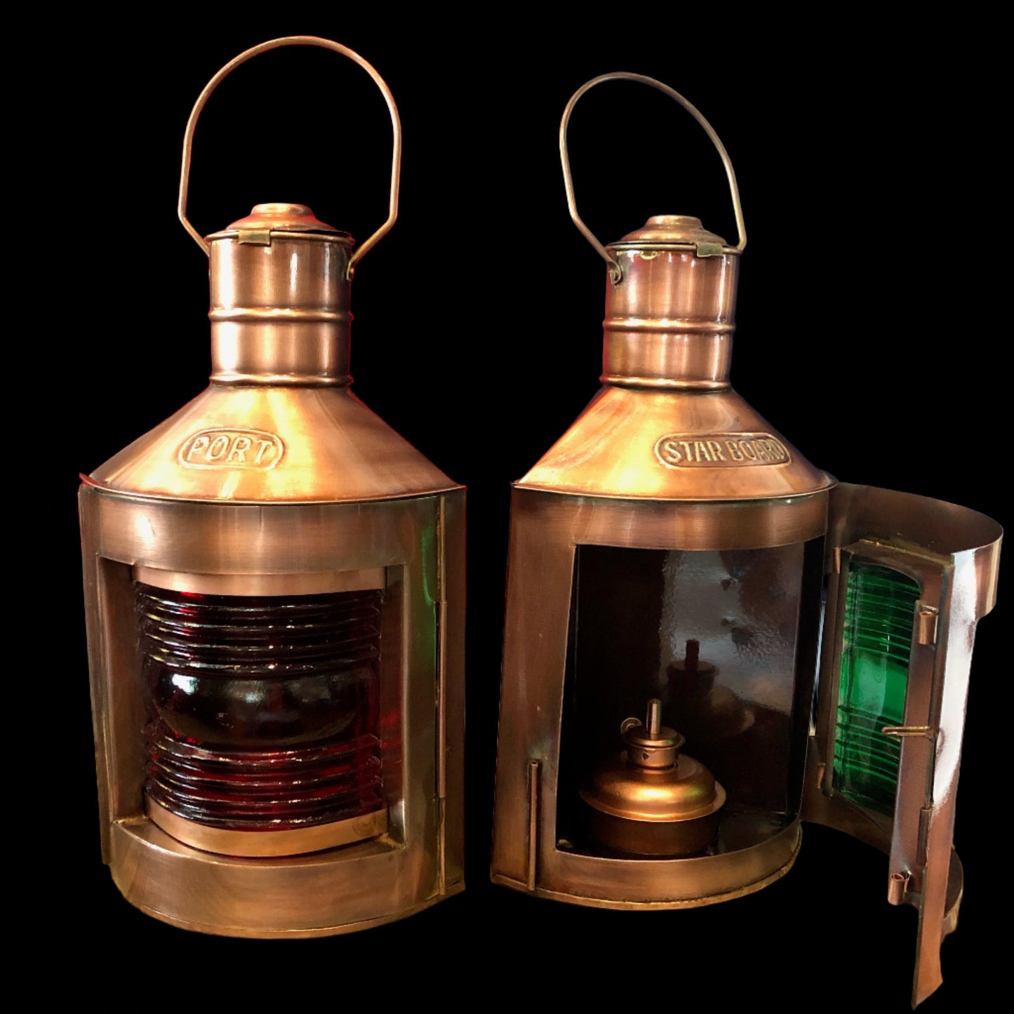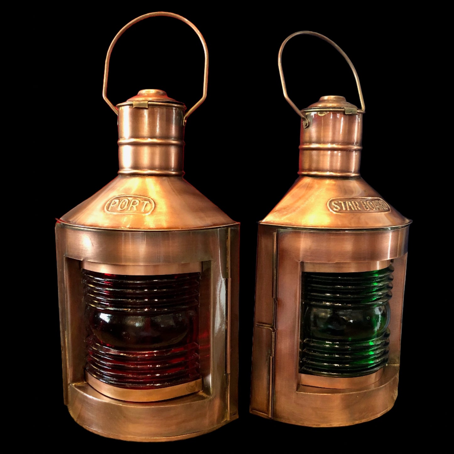 Authentic reproduction copper Port/Starboard lights. 11”x5”. Red and Green fresnel glass. Oil wick lamp inside.