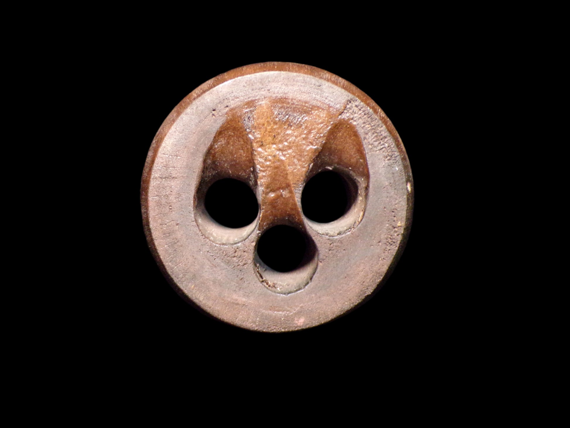 Antique wooden deadeye, measuring 5.5 inches in diameter. Crafted from dense hardwood, this three-hole deadeye features a deep groove around the perimeter for lanyard or shroud rigging, and smooth wear from decades of maritime use. Deadeyes were essential components of traditional sailing ships, used in the standing rigging to tension shrouds and stays before the advent of metal turnbuckles. This example shows a rich, dark patina and well-defined tooling, making it a fine display piece for nautical collections or maritime décor.