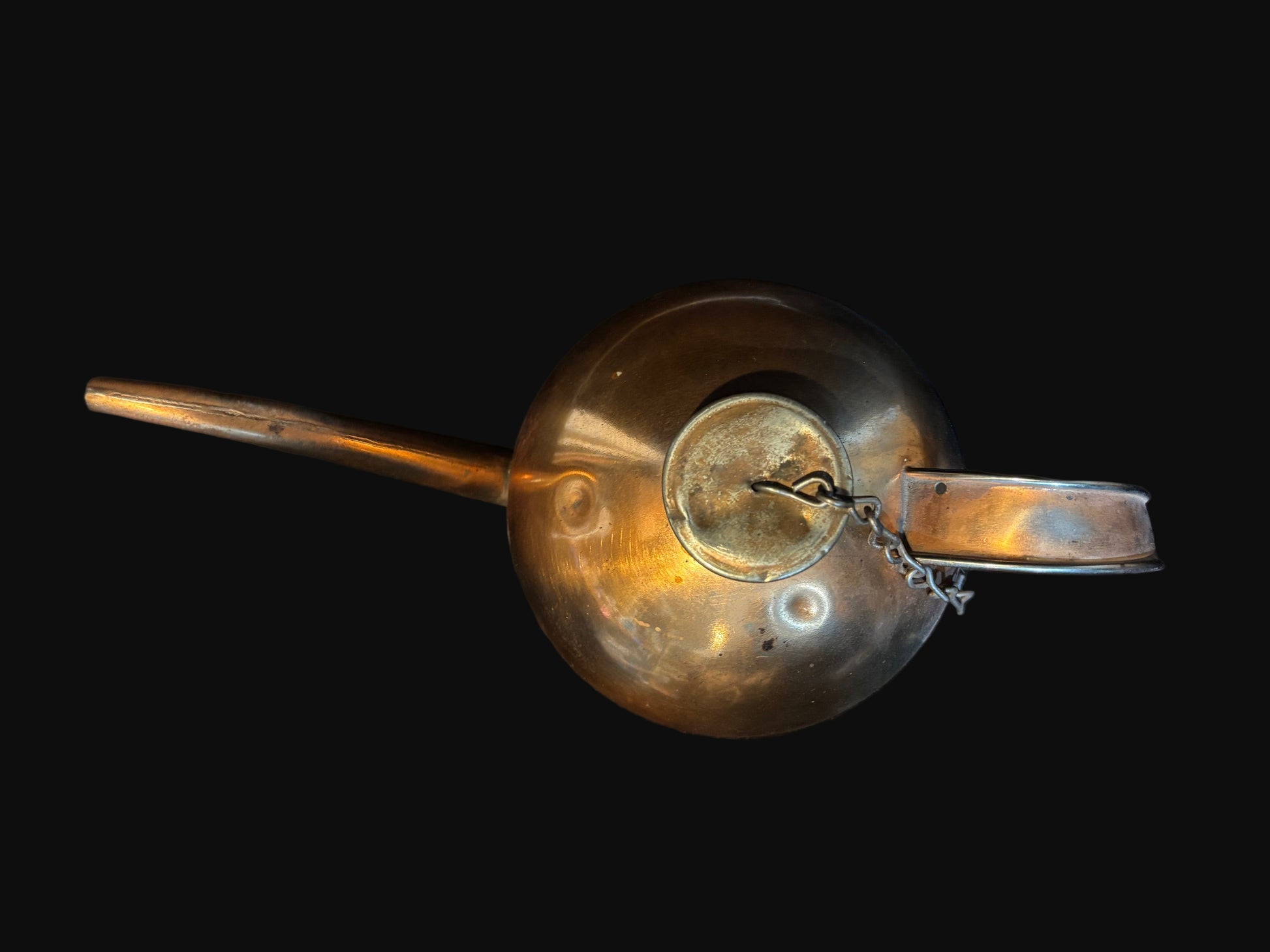 This authentic brass engine room oiler was once part of the daily operation aboard a working vessel — used to lubricate moving parts below deck where reliability was essential. Constructed of solid brass for corrosion resistance in harsh marine environments, it features a long precision spout, rolled seams, and its original chain-attached cap.