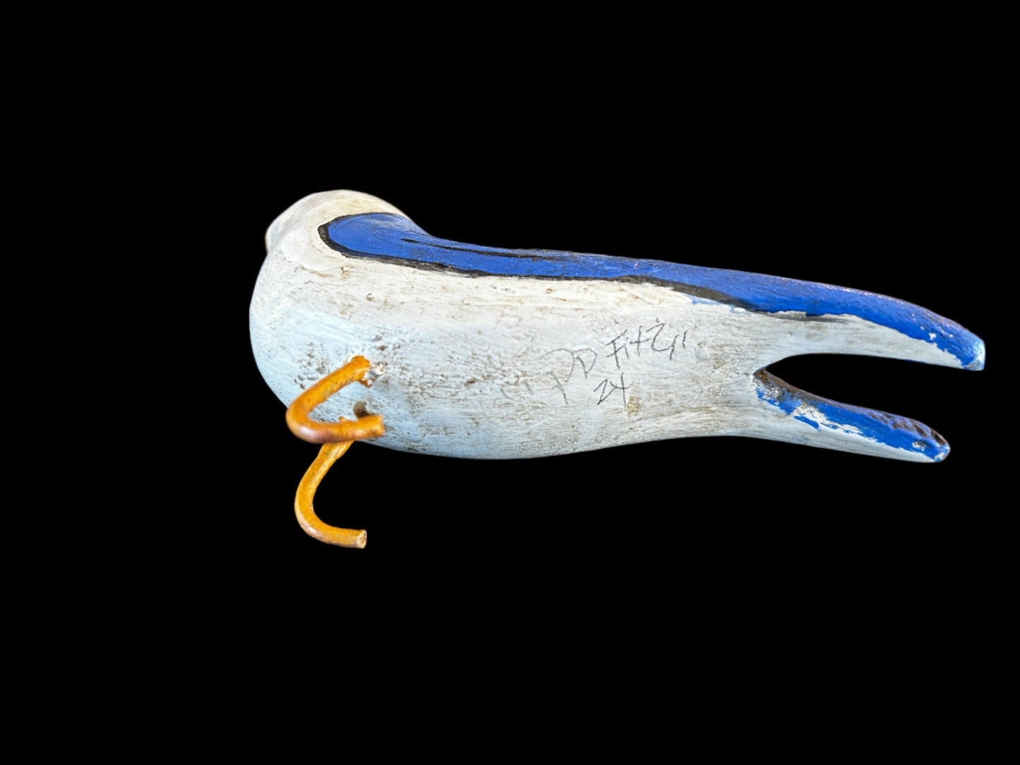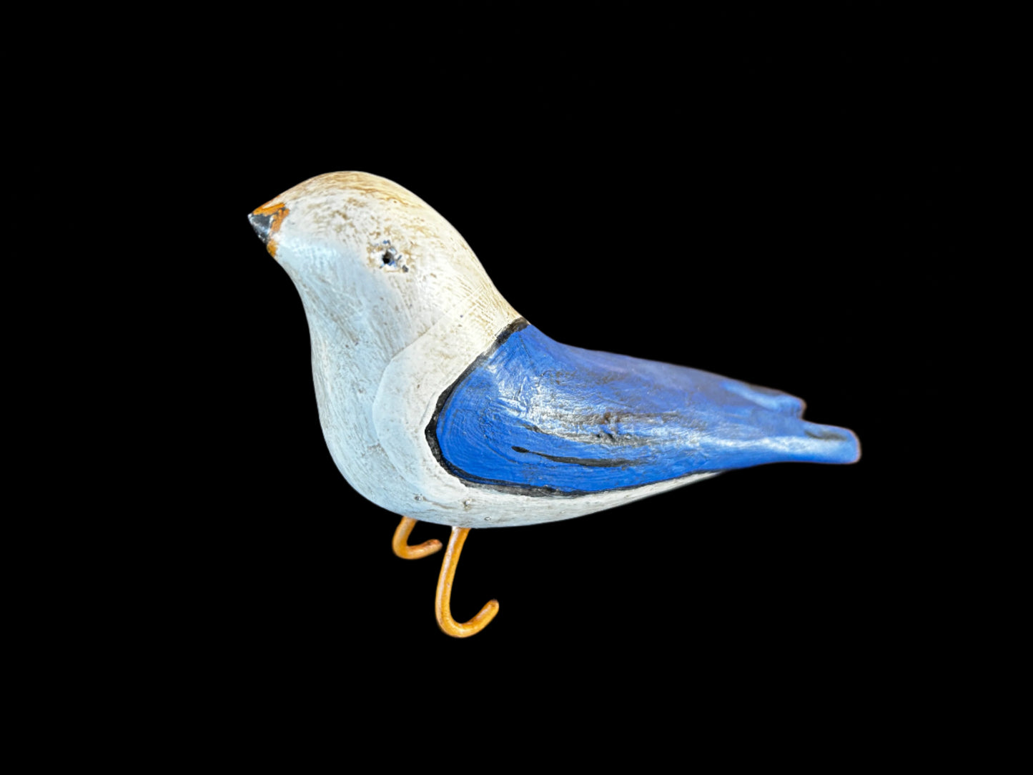 Expertly hand-carved by local artist Patrick Fitzgerald, this beautiful bluebird is a truly one-of-a-kind piece. Crafted with precision and care, this delicate piece will bring a touch of nature and artistry into your home. Support the local art community and add a unique touch to your decor.