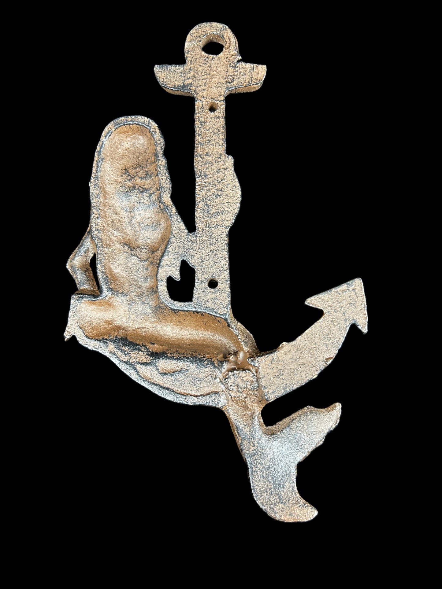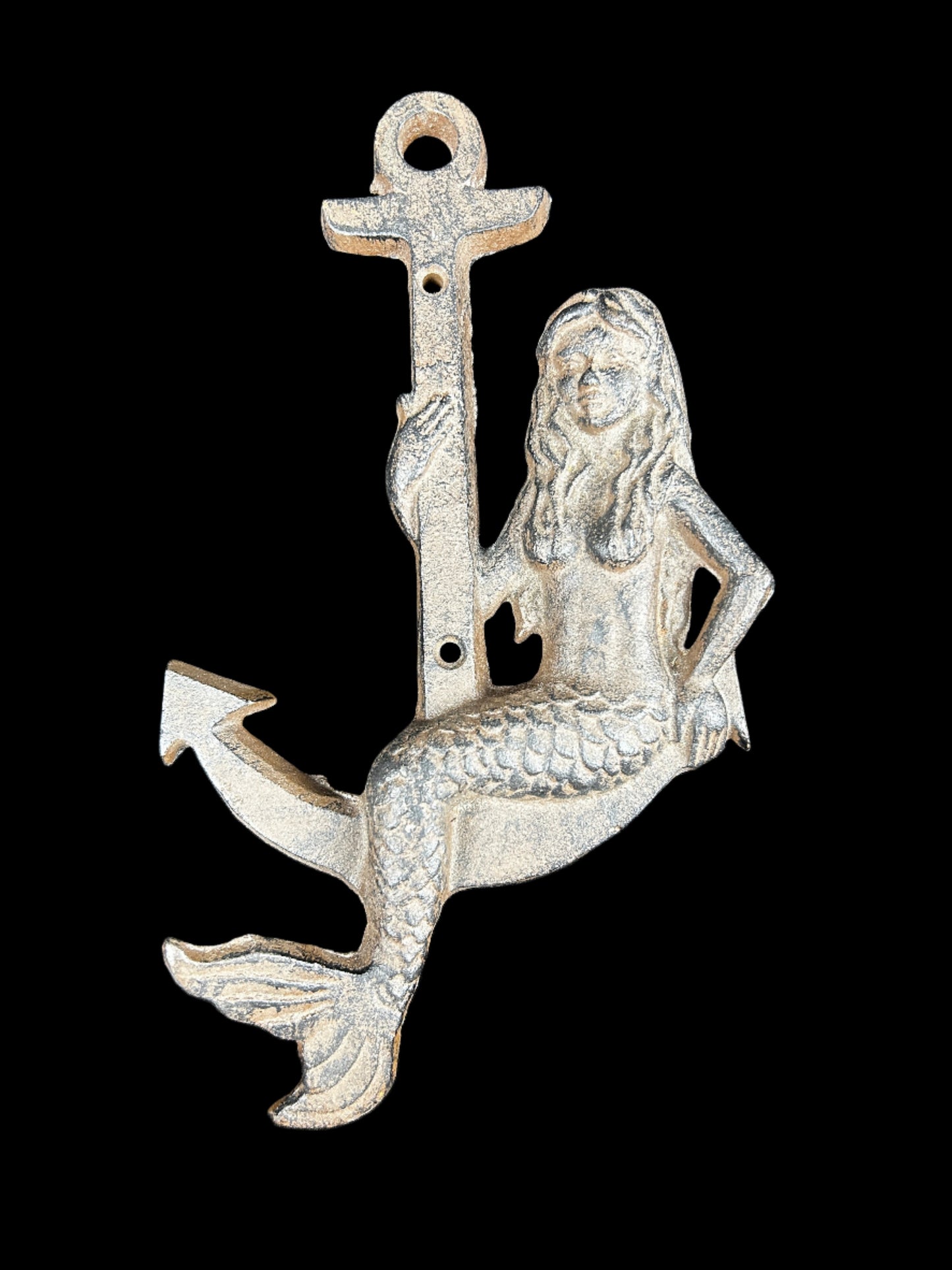 Crafted with intricate detail and expert artistry, this captivating piece features a majestic mermaid gracefully seated upon a sturdy anchor. Cast in high-quality metal, the sculpture exudes elegance and maritime charm, making it a striking focal point for any space.
