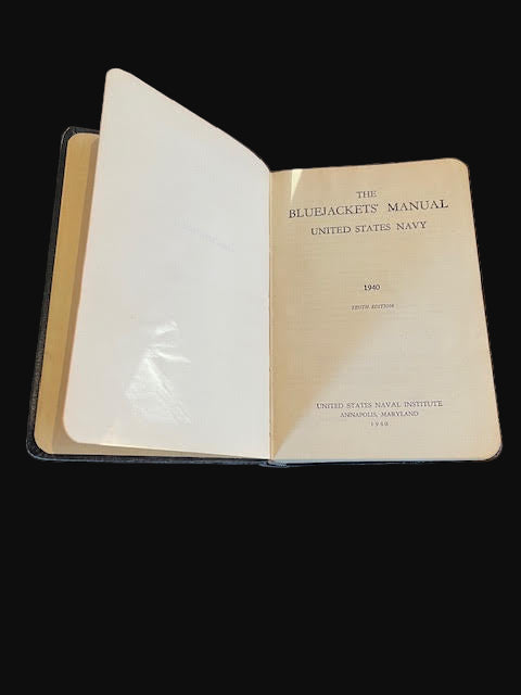 The Bluejackets' Manual: A copy of the 1940 Bluejackets' Manual that was given to sailors covering rudimentary seamanship, physical drills, landing and gunnery. This particular manual belonged to "Donald R. Waters" and contains his signature and handwritten notes.