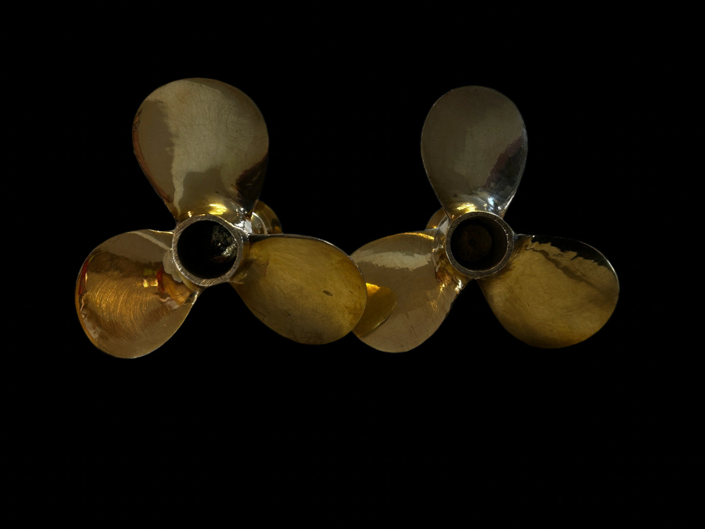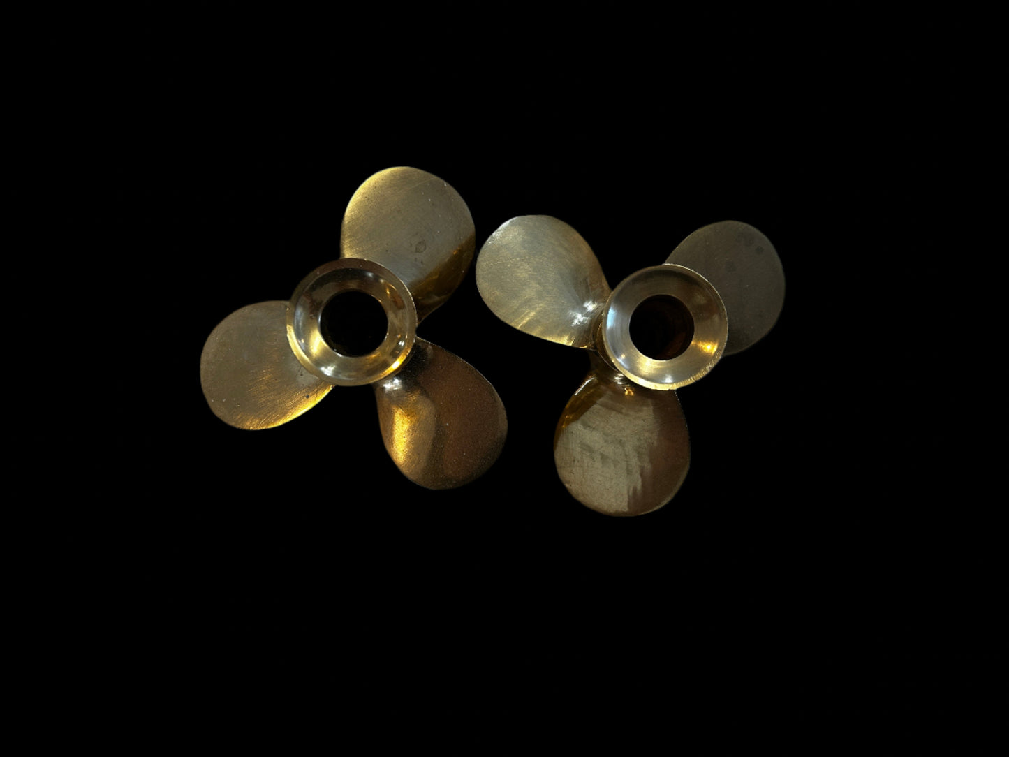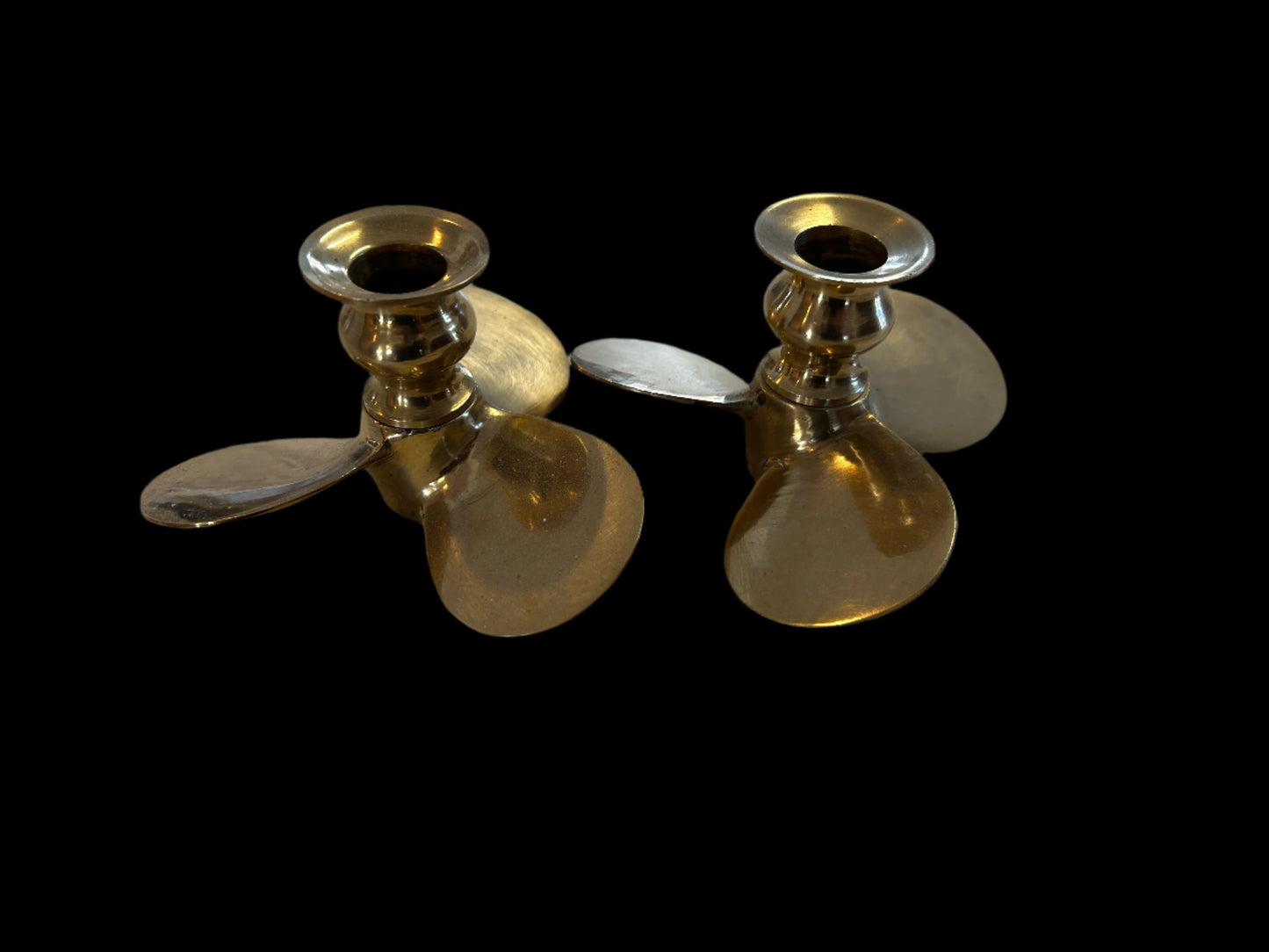 Introducing our pair of brass propeller candlestick holders. Made from high-quality brass, these candlestick holders add a touch of elegance and sophistication to any room. With their unique propeller design, they are sure to be a conversation starter while providing a secure and stylish way to display your favorite candles.