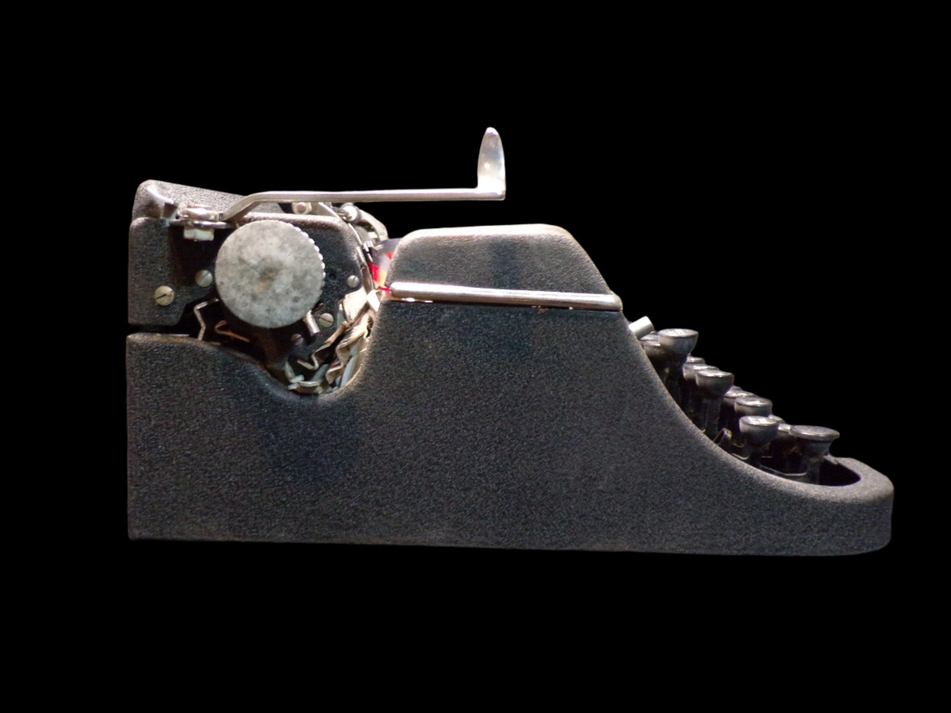 This handsome Underwood Universal portable typewriter is a classic example of mid-20th century design and craftsmanship. Compact yet sturdy, it features a sleek black metal body with chrome accents, round glass-topped keys, and its original red-and-black ribbon still threaded in place.