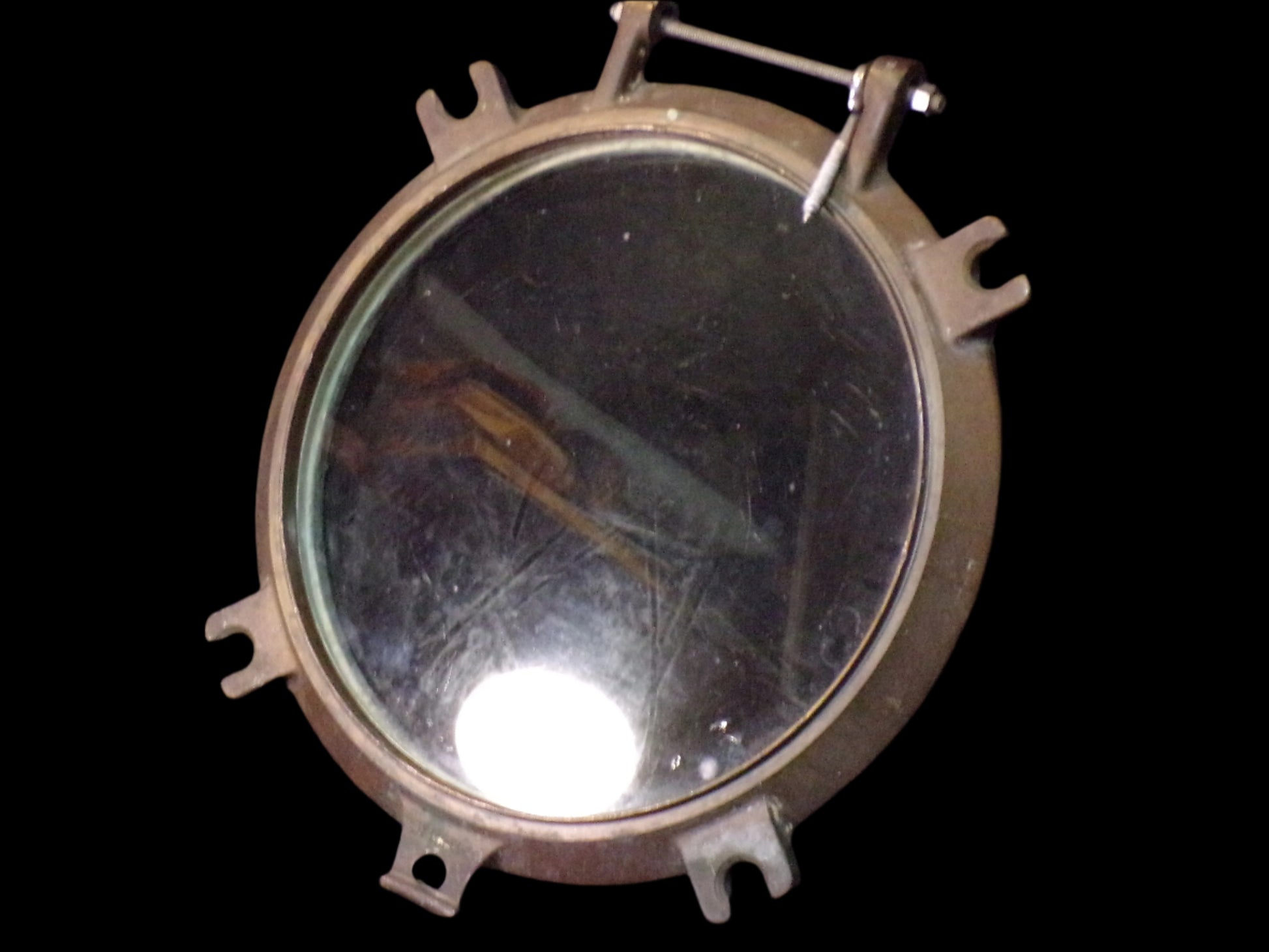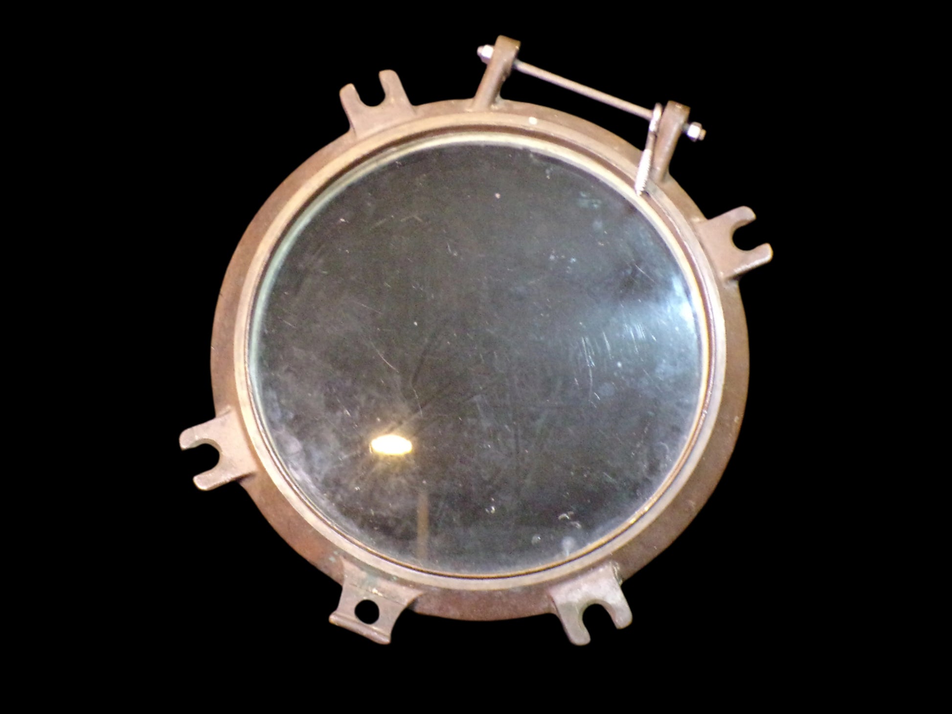 This antique brass porthole cover was salvaged from a private collection. It measures 20 inches across with 15 inches of clear opening in the center. The thick glass is intact but shows signs of use, including surface scratches and a light fogged appearance. This piece is structurally sound, making it a solid candidate for restoration or repurposing.  We could add a mirror to this piece to make it a cool addition to a bathroom or hallway.
