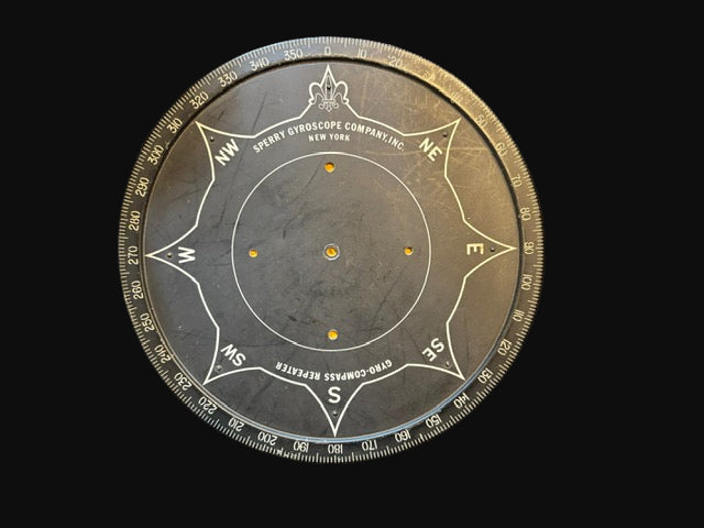 This is an original gyro-compass repeater dial faceplate, manufactured by the Sperry Gyroscope Company, New York, a leading supplier of precision navigational instruments to the U.S. Navy and commercial shipping fleets throughout the mid-20th century.
