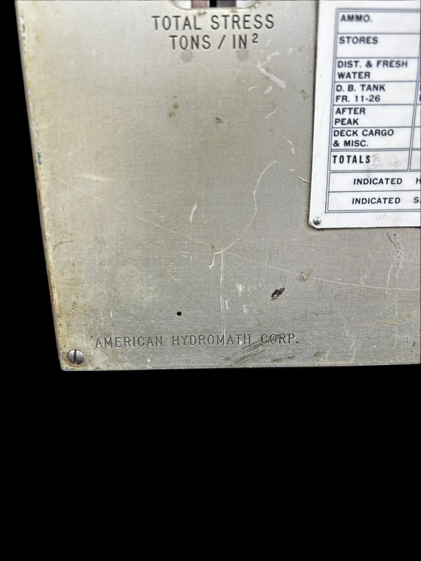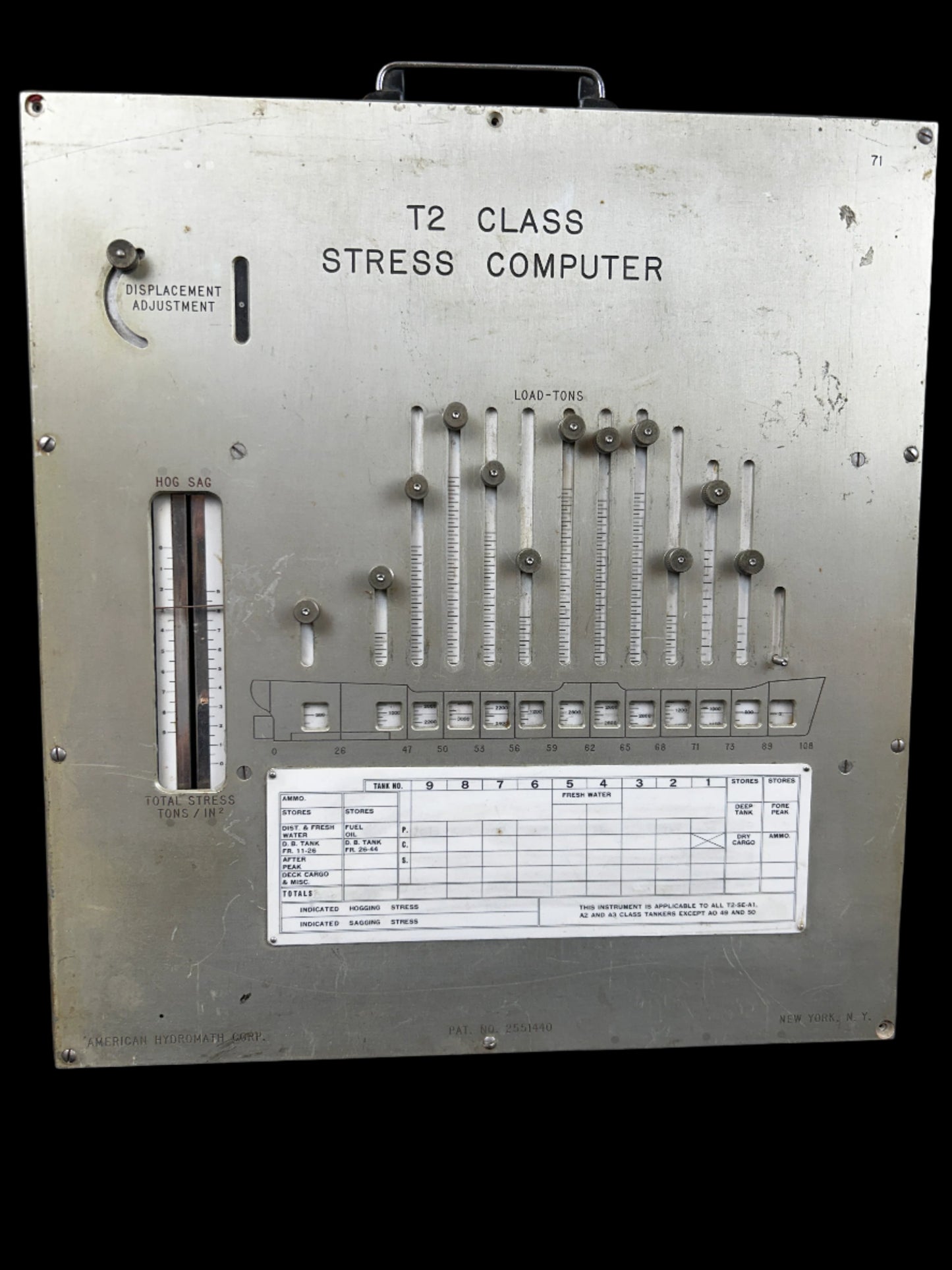 The T2 Class Stress Computer by American Hydromath Corp. was a specialized, mechanical device used primarily for calculating stress and load distributions in engineering contexts, likely aboard ships or in other marine applications. Known for precision, it was valuable in cargo management and structural analysis, allowing users to input variables related to weight and tension to optimize load distributions. These devices are rare today and of interest to collectors of maritime or mechanical engineering artifacts.