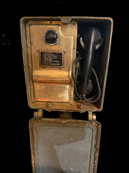 Crafted from heavy-duty brass, the box retains its natural patina and original components—including handset, selector dial, and interior faceplate. Mounted on a sturdy steel post with wooden base, it’s perfect for display in a nautical-themed space, man cave, or collector’s gallery.